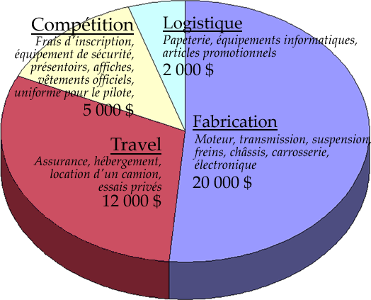 L’existence et le succès de l’équipe sont entièrement dépendants du support de nos commanditaires. La construction d’une voiture de course est une dispendieuse aventure qui nécessite un financement continu. Le graphique qui suit résume nos dépenses annuelles.